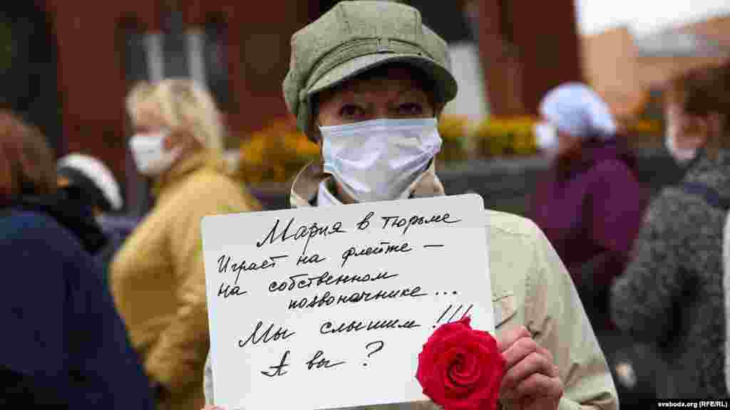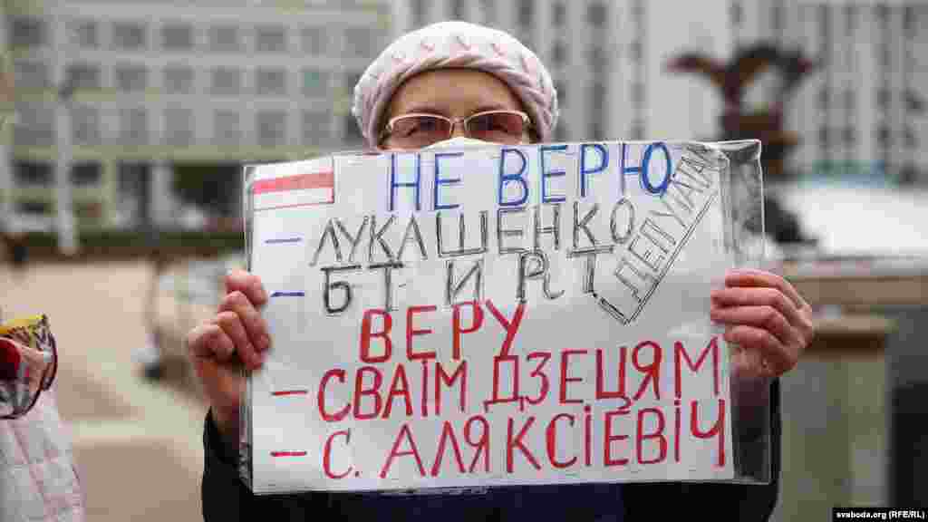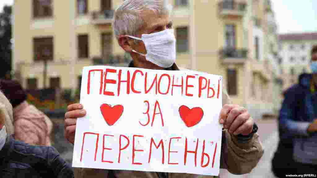 Участники марша несли плакаты "Пенсионеры за перемены", "Нет геноциду белорусского народа", "Я не верю Лукашенко, БТ, RT и депутатам, верю своим детям и Светлане Алексиевич", "Пенсионеры против беспредела, насилия и лжи".