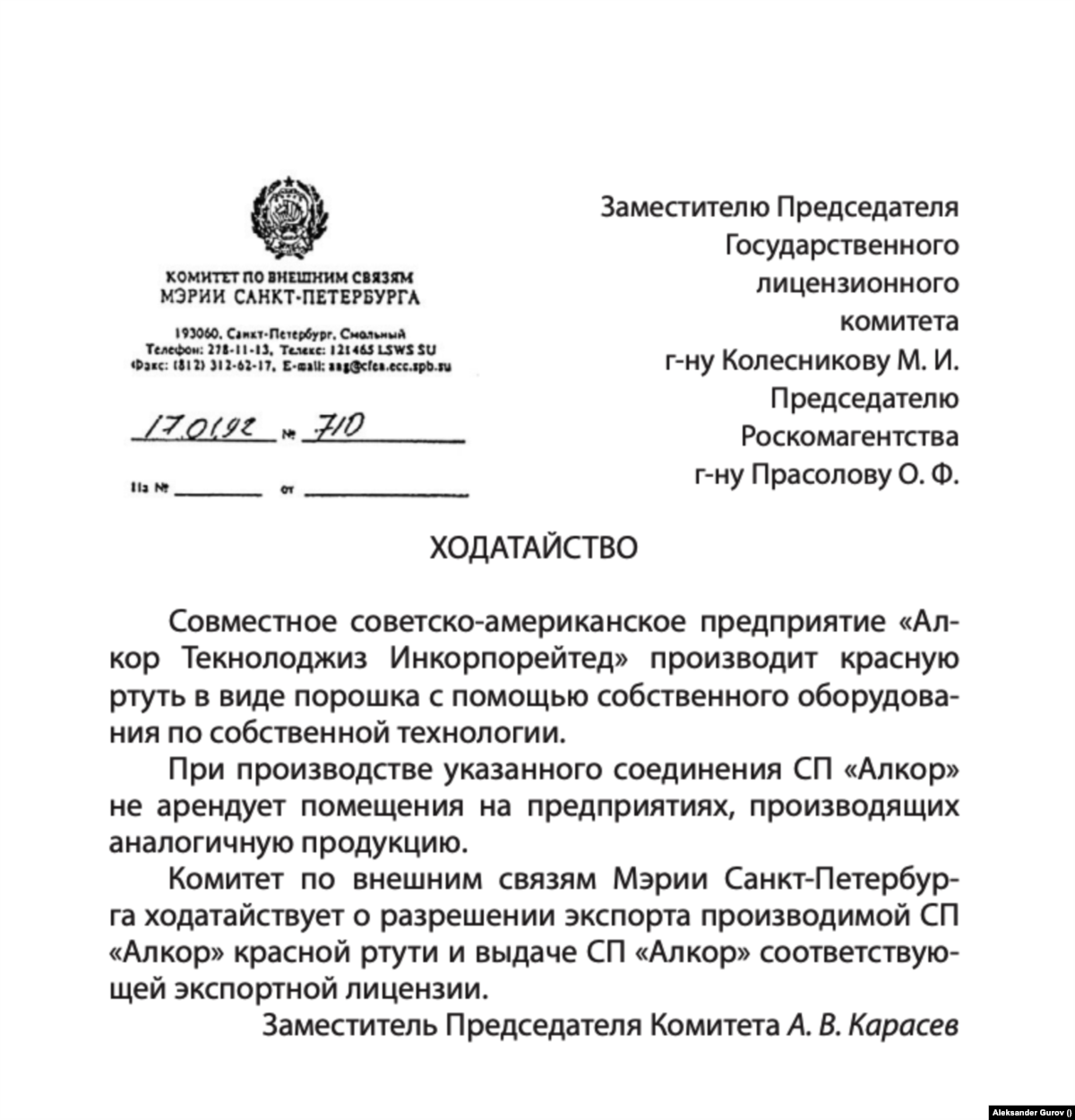 Видимо, это письмо не возымело действия, потому что в январе 1992 года в лицензионный комитет пришло письмо уже на бланке комитета внешних связей петербургской мэрии. Как и до этого Прасолов, комитет просил выдать "Алкору" разрешение на вывоз красной ртути и экспортную лицензию. Ходатайство было подписано заместителем Путина Анатолием Карасевым.