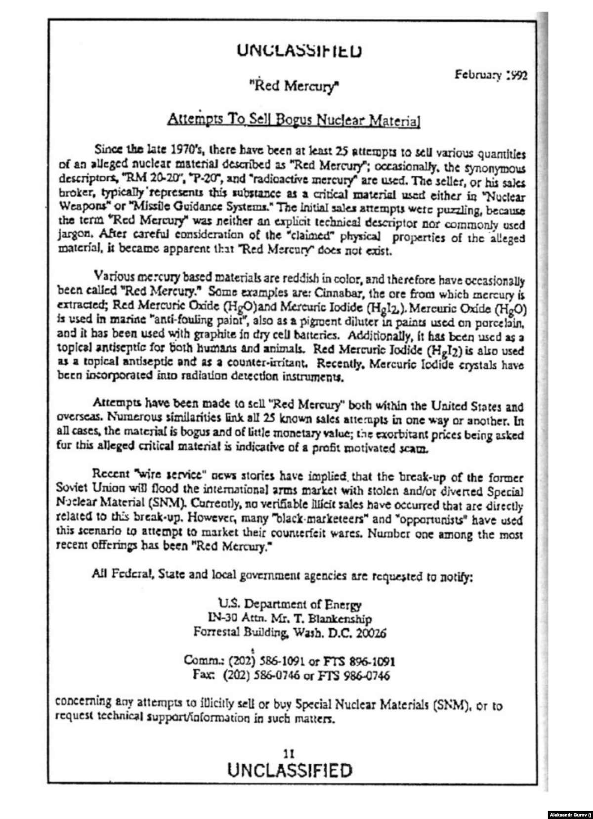 Торговать красной ртутью пытались, судя по всему, еще в 1970-е годы. В феврале 1992-го департамент энергетики США выпустил циркуляр под названием "Попытки продажи поддельного ядерного материала". "Начиная с конца 1970 годов было предпринято по крайней мере 25 попыток продажи [в США и других странах] различного количества ядерного материала, описываемого как "красная ртуть", иногда как синонимы используют "RM 20-20", "Р-2-" и "радиоактивная ртуть". Продавец или его брокер обычно представляет это вещество как критически важный компонент, используемый или в "ядерном вооружении", или в системе "управления ракетами". <...> Последние новости и разрушение бывшего Советского Союза создали ситуацию, в которой поток украденного или побочно произведенного специального ядерного материала может хлынуть на международный рынок. На сегодня нет подтвержденных продаж, связанных с этой ситуацией. Однако многие представители "черного рынка" и "оппортунисты" используют этот сценарий для попыток продать поддельный товар. Главное из этих последних предложений – "красная ртуть", – говорится в документе, который требовал от американских властей всех уровней уведомлять департамент по энергетике о любых предложениях о продаже этого удивительного вещества.