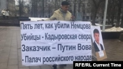 "Пять лет, как убили Немцова, – было написано на плакате. – Убийцы – Кадыровская свора. Заказчик – Путин Вова – Палач российского народа" (орфография авторская).